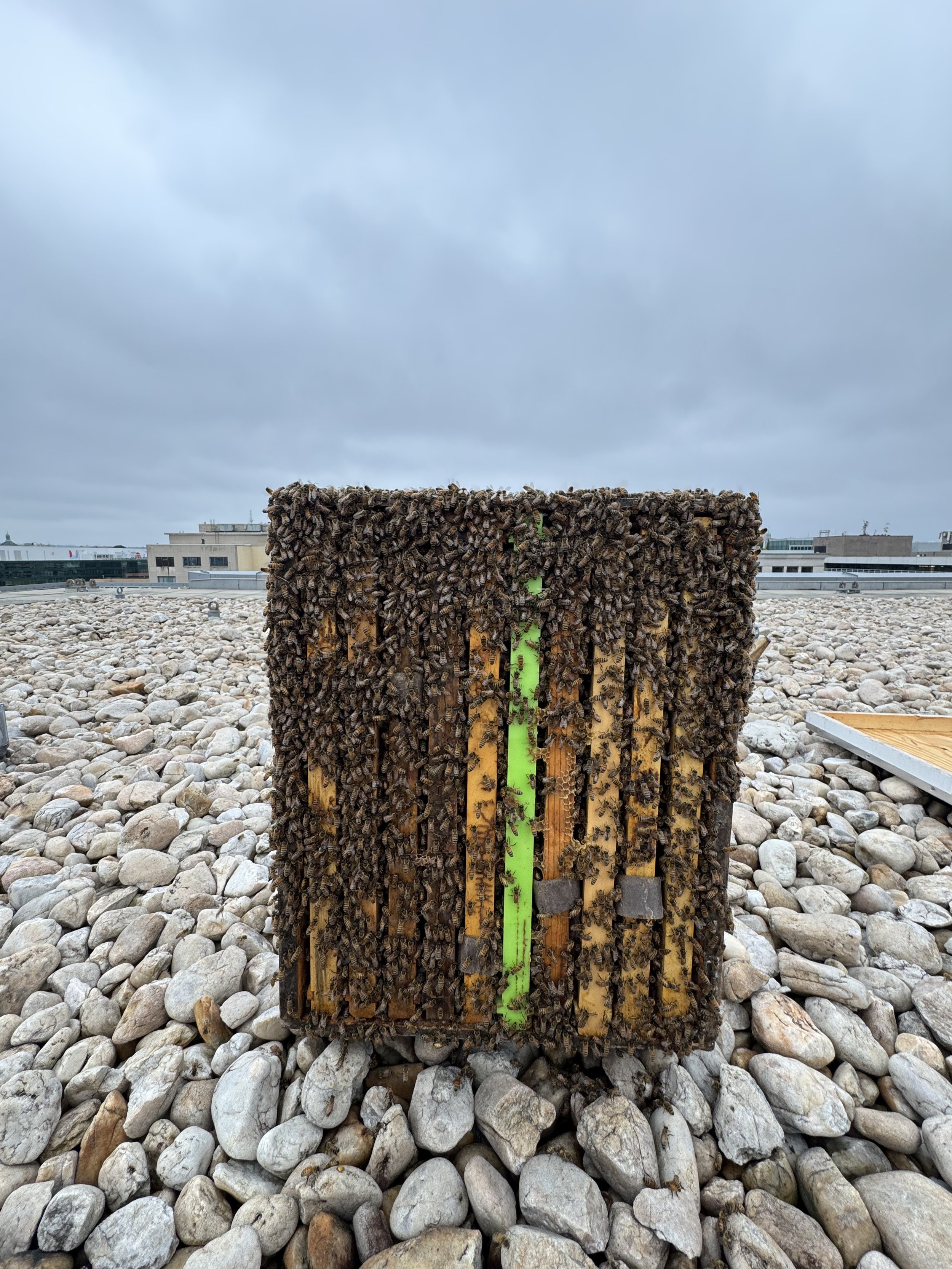 The bees have been pollinating all of the flowering vegetable plants on the rooftop garden like cucumbers, eggplant and peppers which should be harvest-ready starting in July thanks to their work!