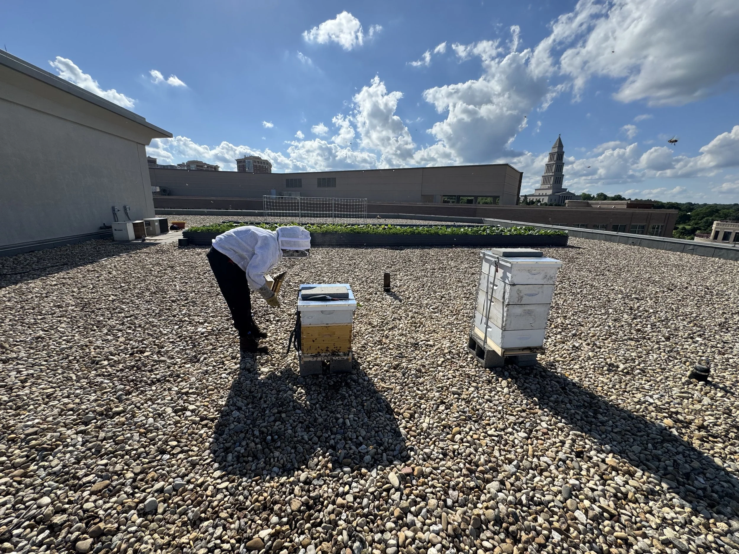The rooftop hives at Carlyle Gateway continued to expand this May as the bees keep bringing in a bounty of pollen and nectar from beautiful Alexandria. The northernmost hive is currently storing and curing their honey harvest into the top-most box, and the queen is continuing to grow the colony–timing her egg laying with the next major flower bloom. The second hive is a little bit behind its next door neighbors, but the queen and her workers are quickly growing their colony! Both hives received their May treatment of organic pest management controls, which should allow them to focus on building their honey reserves and tending to their young.