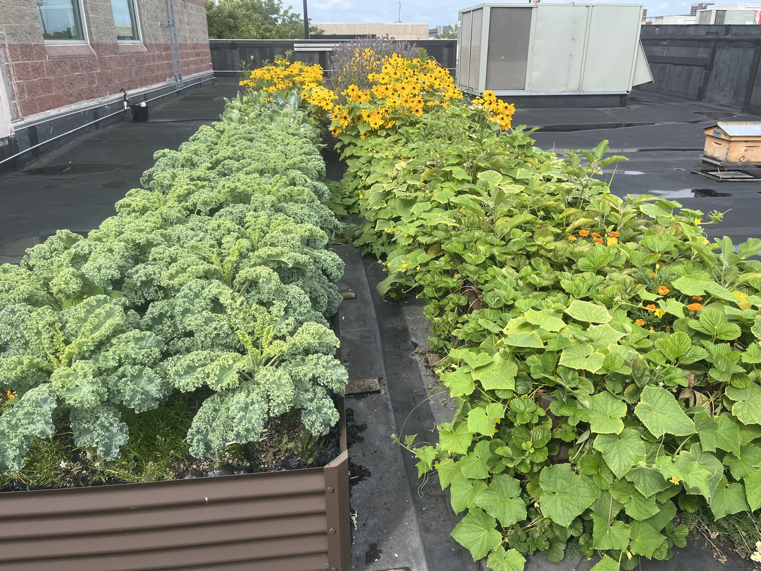 The Tanger Outlet rooftop gardens have been thriving as we move into the summer months. Fruiting vegetables like eggplant, cucumbers, and eggplant have joined the harvest list alongside the still productive greens. Our pollinator gardens are bursting with biodiversity. We regularly spot, lady bugs, monarch butterflies, migratory birds, and other important wildlife.