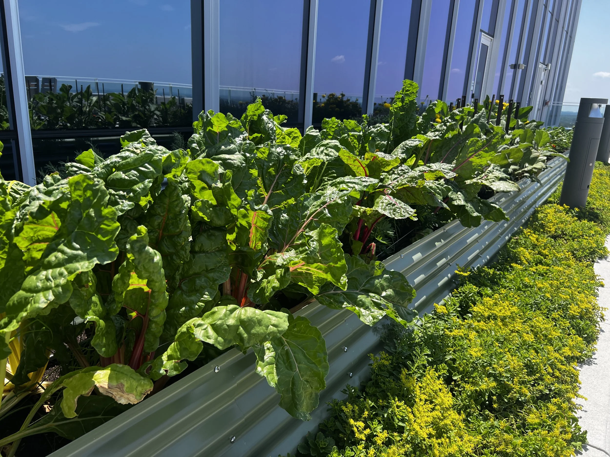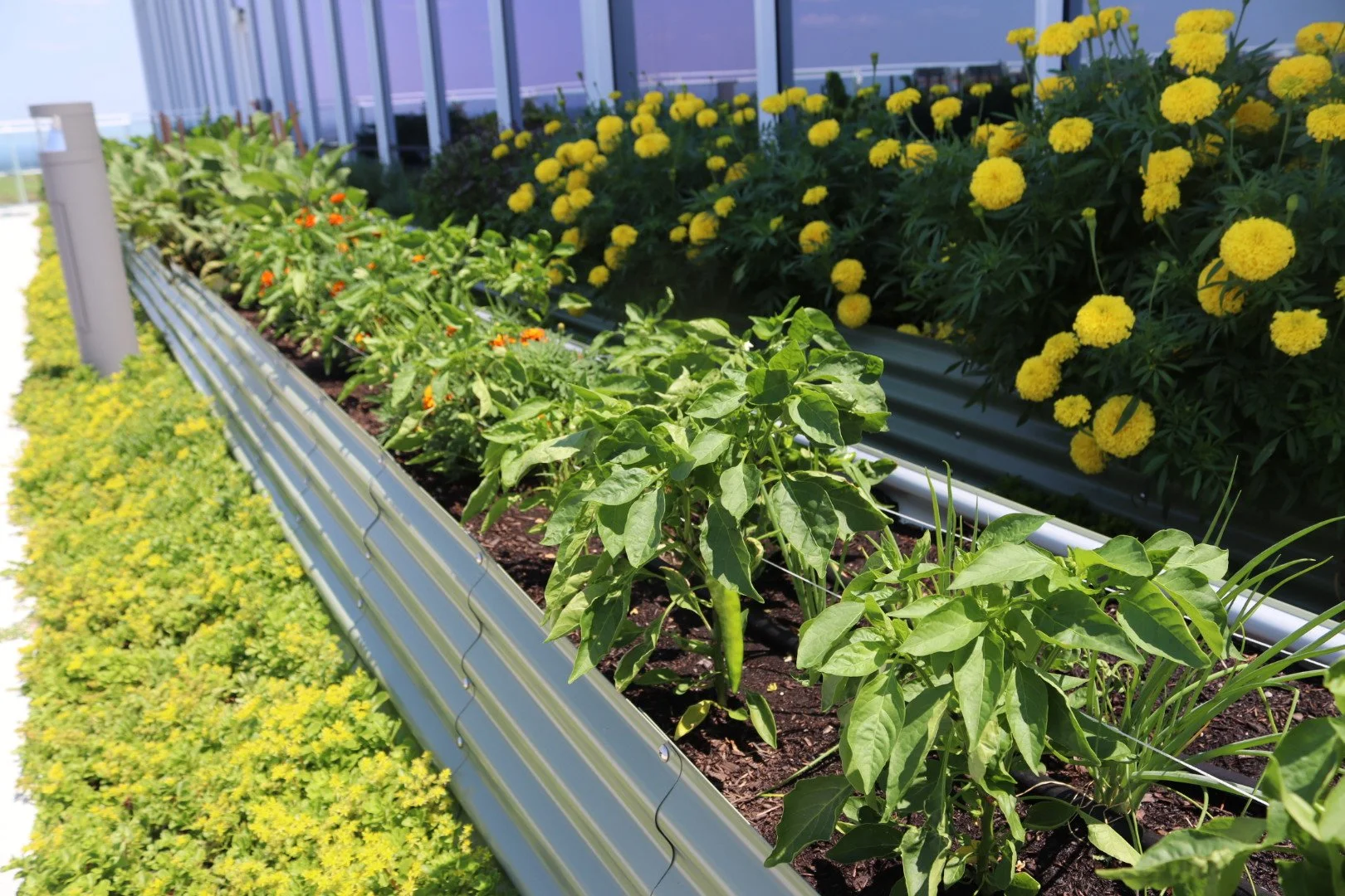 In partnership with BXP, the garden at 1950 Opportunity was built in 2024 to transform a green roof space into a productive garden to be enjoyed by building tenants. Directly next to the tenant patio space on the 21st floor of the Reston, VA building, the garden is bustling with greens, culinary herbs, vegetables, and pollinator flowers. The garden is harvested by Up Top Acres farmers and set out for the building tenants to enjoy throughout the growing season!